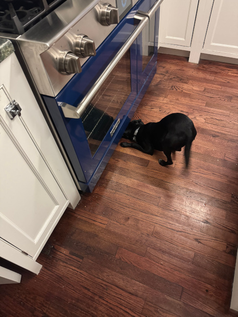 Never good when the rat terrier mix is desperate to get to something under the stove. Fortunately, it was just a tennis ball.