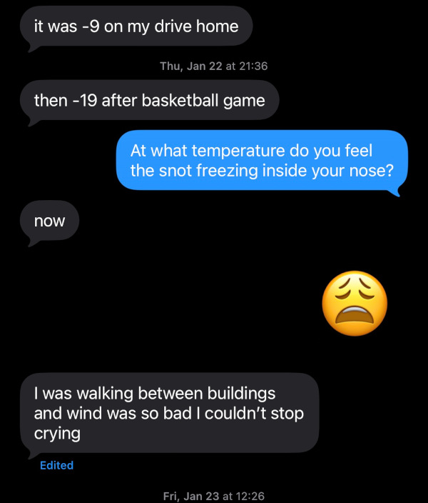 Last week, I texted with my boy JC in Minnesota to see how the winter weather was hitting them. Here are some highlights.